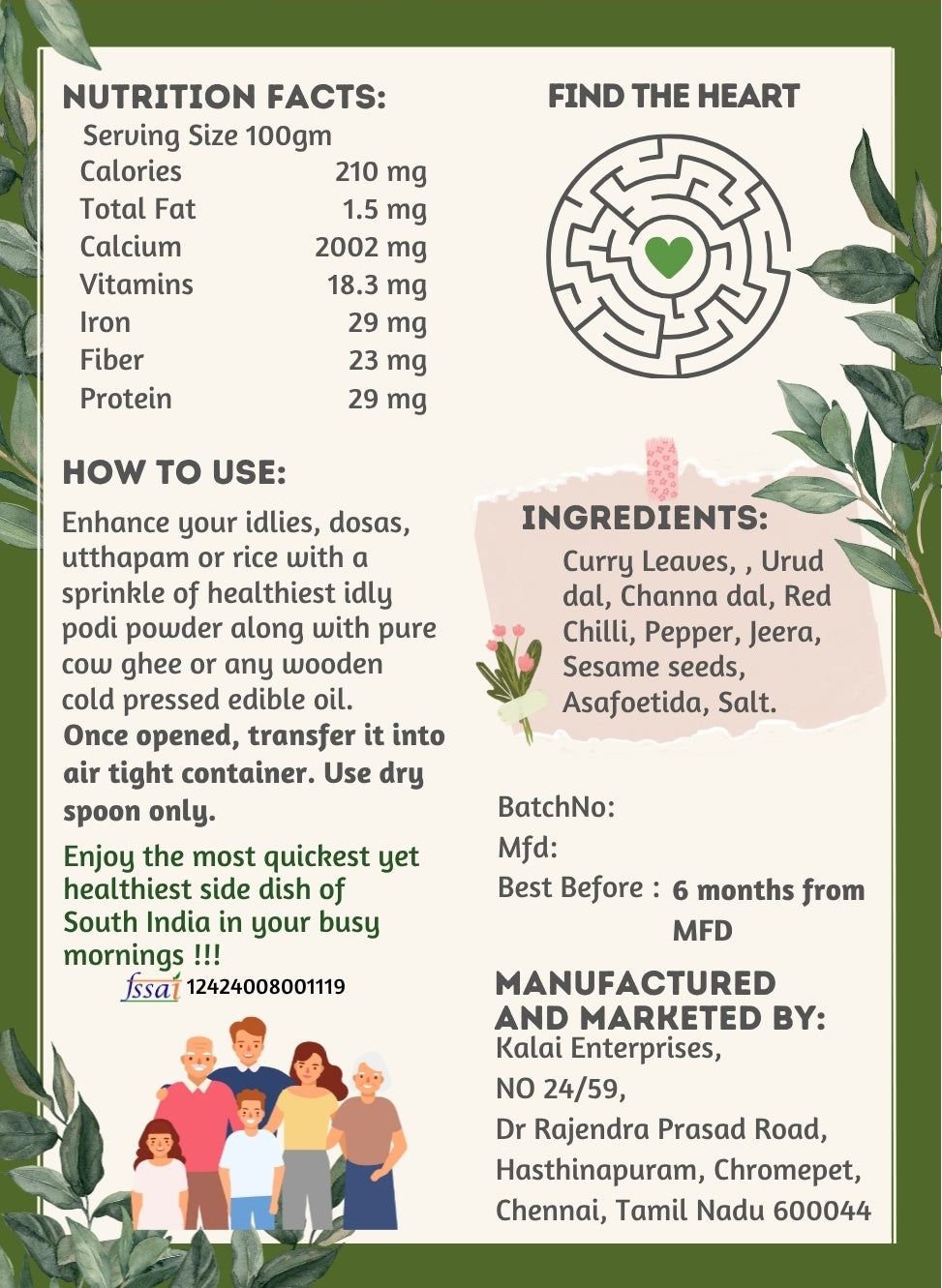 Enjoy the authentic taste of South India with Aurtee's Pure Curry Leaves Idly Podi, made from high-quality curry leaves and aromatic Indian spices. A perfect blend for enhancing your meals with rich flavors and health benefits.