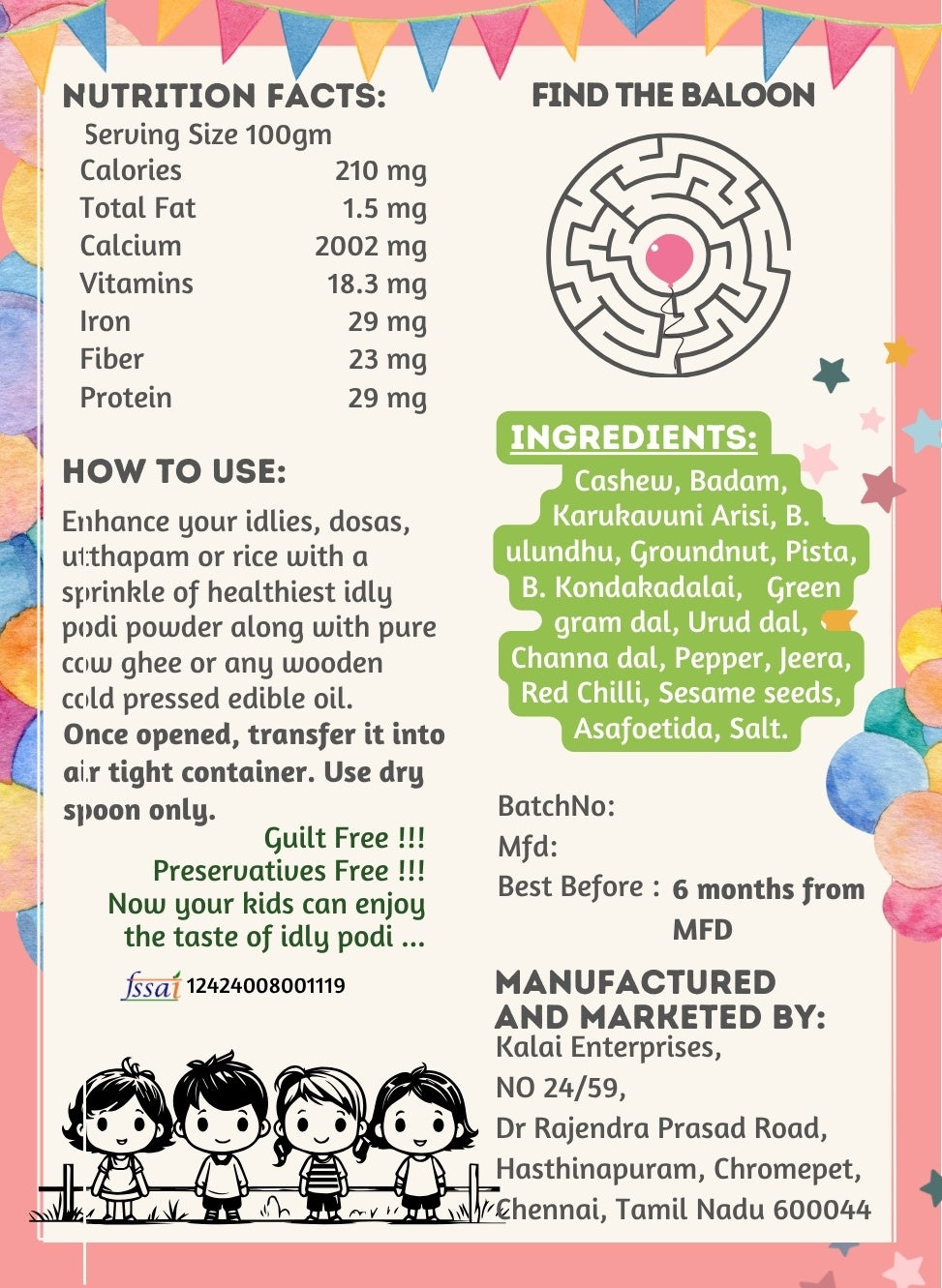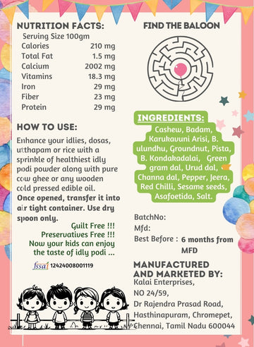 Make meals special with Aurtee's Pure Kids Special Idly Podi, crafted with kid-friendly ingredients like cashew, groundnut, badam, pista, and green gram dal. Packed with nutrients for your little ones' growth and development.